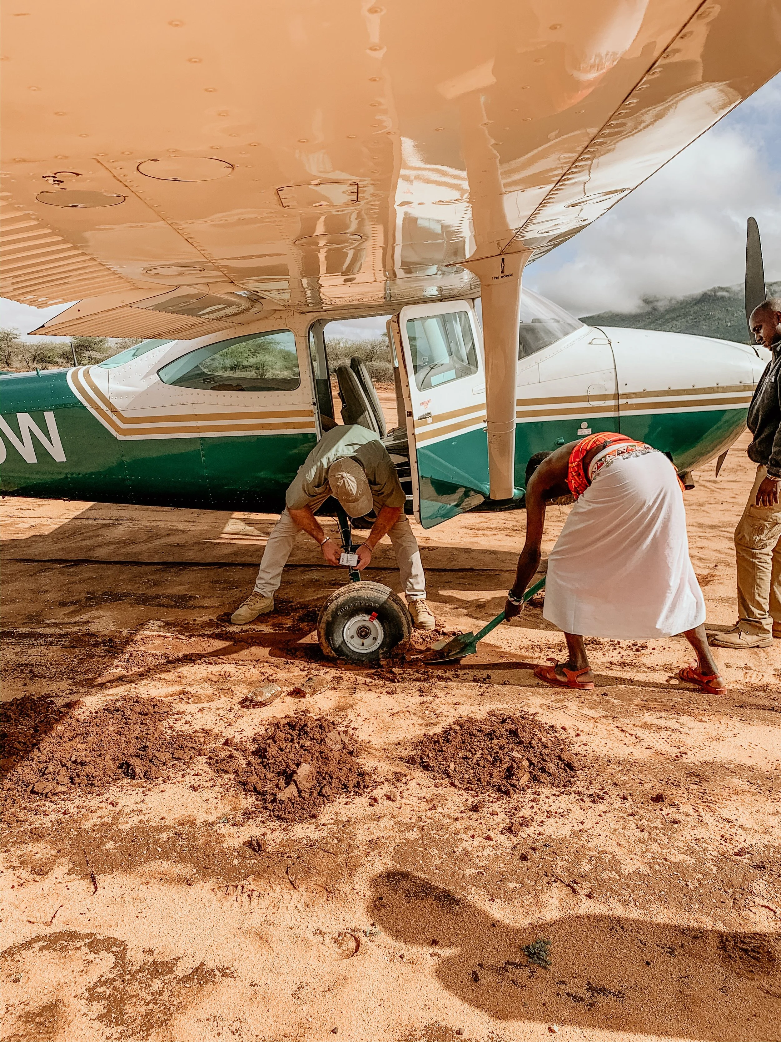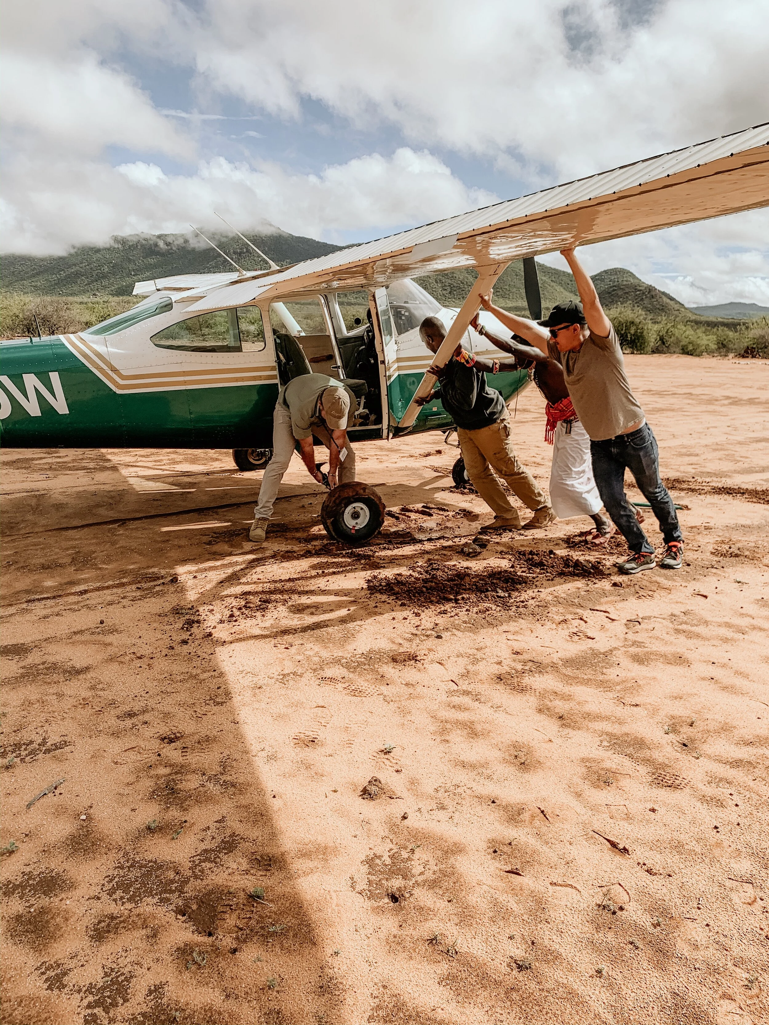 Because of the heavy rainfall from the previous night, the airstrip was so damp & soft that our plane got stuck.